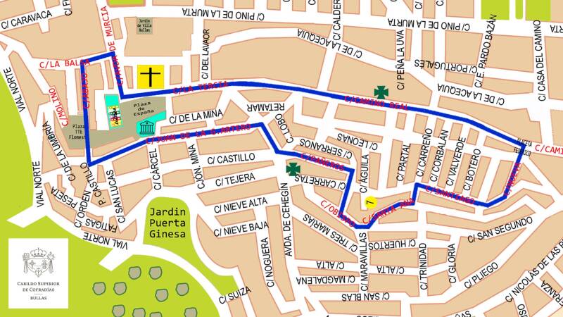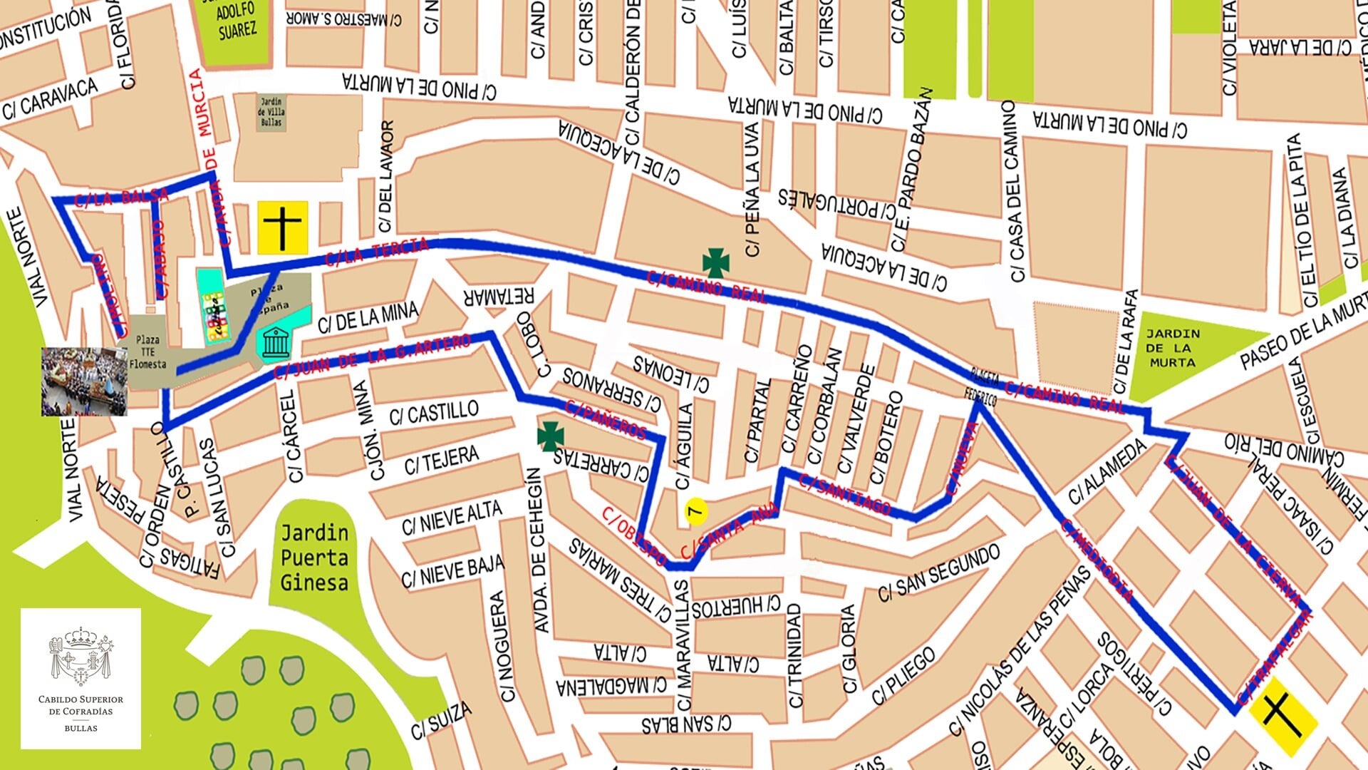 Plaza de España, avenida de Murcia, calle de la Balsa, calle Molino, Plaza Vieja, calle Artero (“Honda”), avenida de Cehegín, calle Pañeros (“Estrecha”), calle Serranos, calle Obispo, calle San Segundo, calle Santa Ana, calle Carreño, calle Santiago, calle Fiel («Fieles»), calle Camino Real, calle de la Tercia y Plaza de España